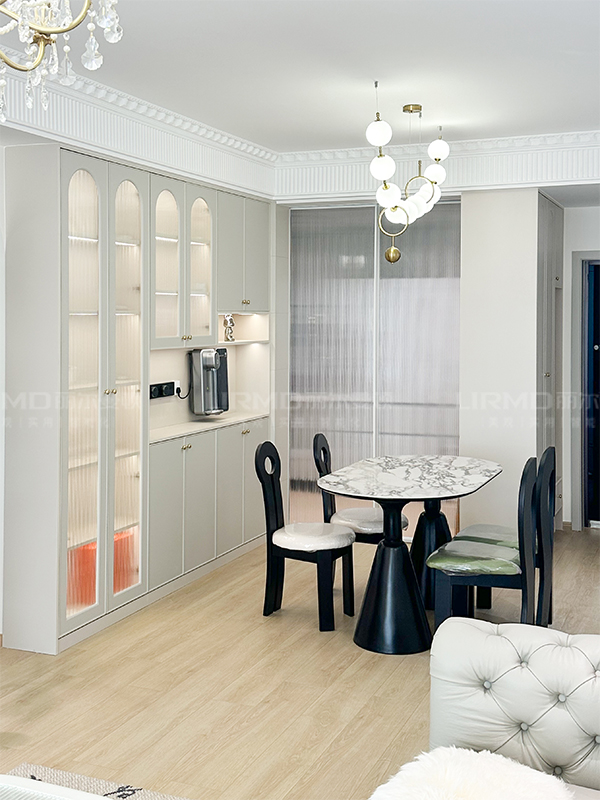 整體是法式裝修風(fēng)格,采用拱形門(mén)板造型以及玻璃門(mén),通過(guò)燈帶的襯托下?tīng)I(yíng)造出法式的浪漫與唯美