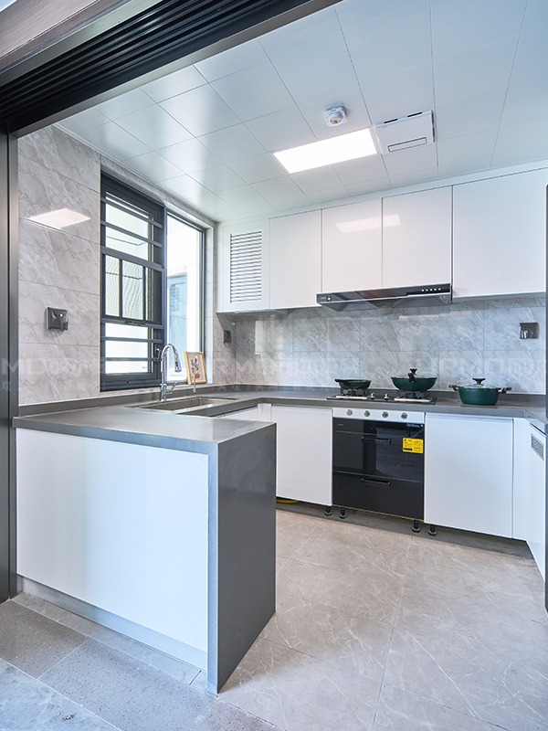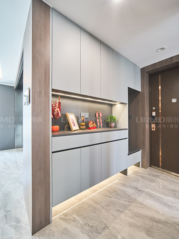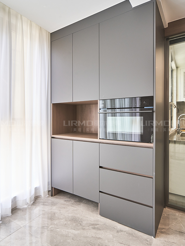 整個(gè)客餐廳以及陽臺(tái)等公共區(qū)域全部做了免拉手設(shè)計(jì),利用免拉手的線條分割柜門,簡單又不失細(xì)節(jié),非常顯高級(jí)感