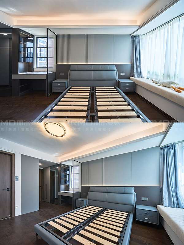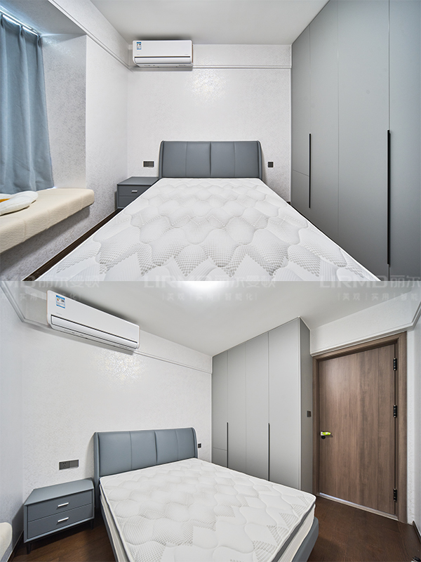 全房做了隱形門結(jié)合護(hù)墻板,電視背景做了巖板設(shè)計(jì),電視內(nèi)嵌,條柜做灰色調(diào)色搭配木紋色,輕奢感滿滿