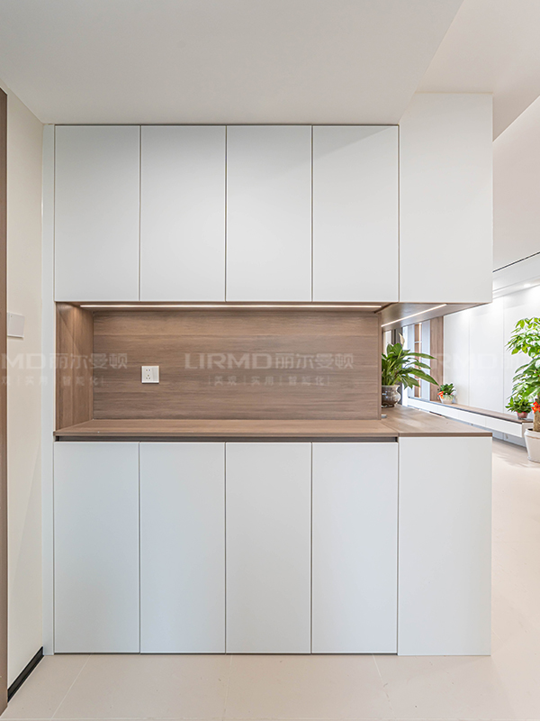 鞋柜和餐邊柜做了轉(zhuǎn)角銜接在直接連著沙發(fā)背景墻,電視柜和隱形門結(jié)合,整個空間簡約而不失時(shí)尚