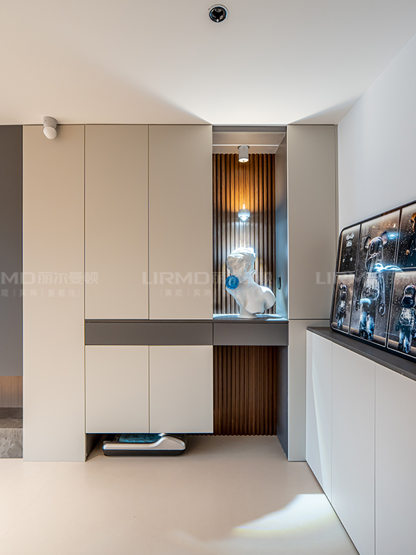 入戶鞋柜采用懸浮穿插設計,更具設計感,搭配飾品使空間更生動