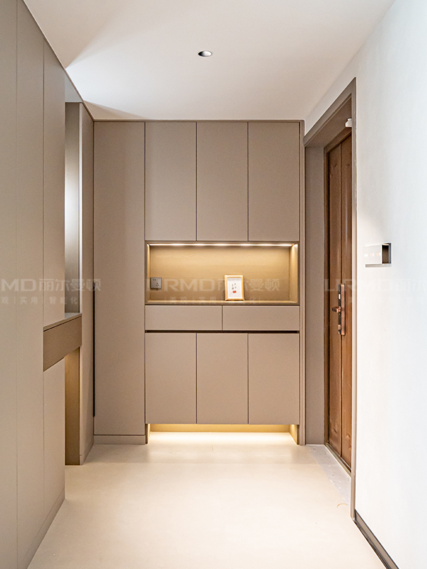 改造L型玄關收納柜,玄關柜采用穿插設計手法,打破常規(guī)鞋柜格局,呈現進門即是景的視覺沖擊力