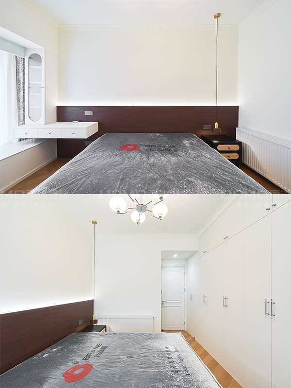 少部分溫潤的木色運(yùn)用,點(diǎn)綴整個空間,部分石膏線條的運(yùn)用,使得整個背景墻更有層次不顯單調(diào)。
