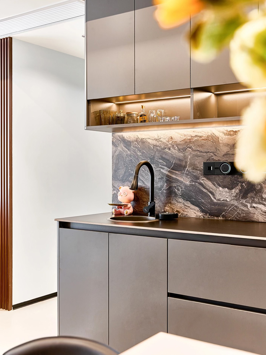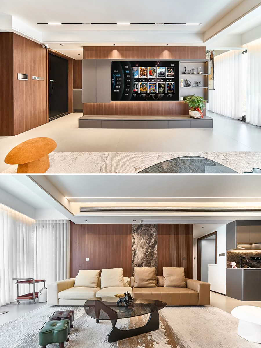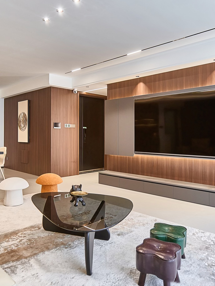 整體采用暖棕意式極簡(jiǎn)搭配,搭配巖板、格柵做沙發(fā)背景墻。