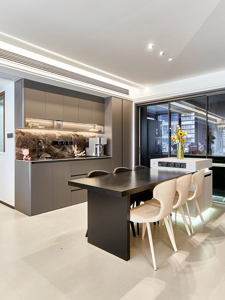 客餐廳無(wú)主燈吊頂,搭配線條燈帶增加光源,視覺(jué)有延伸感。