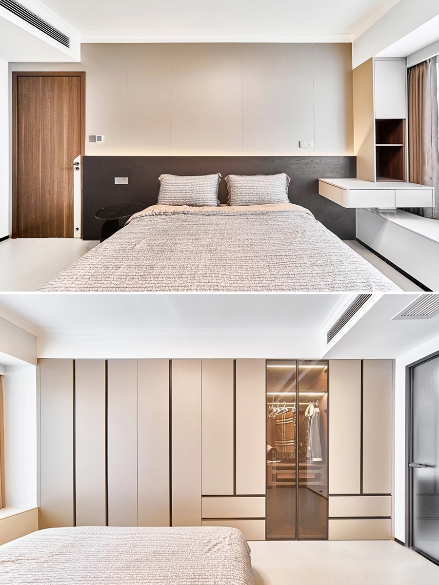 滿墻衣柜通體型材拉手,一門(mén)到頂極簡(jiǎn)又高級(jí)。