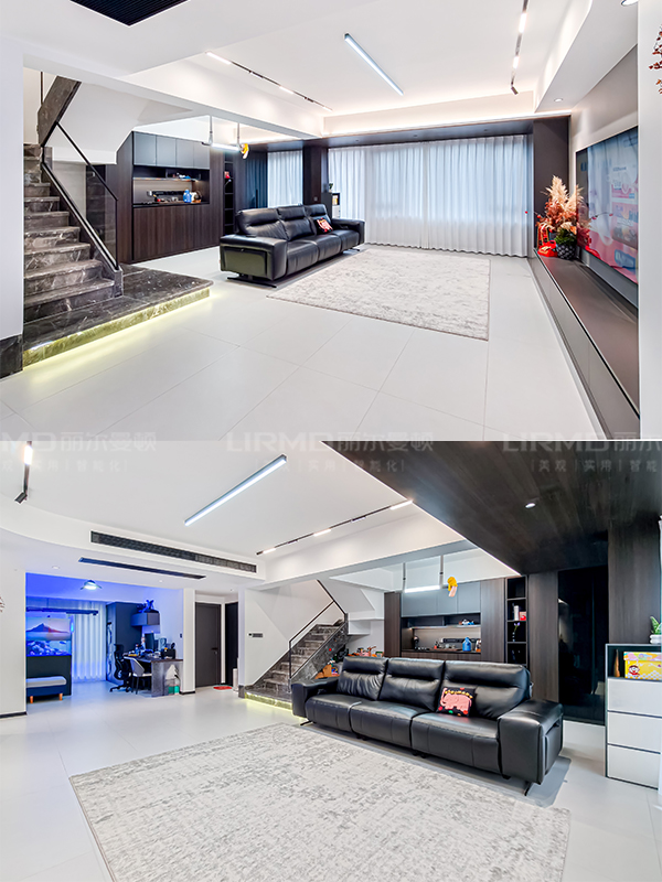 全屋無主燈,采用懸浮吊頂+嵌入式筒燈+磁吸軌道燈,光影層次分明,夜晚氛圍感直接拉滿