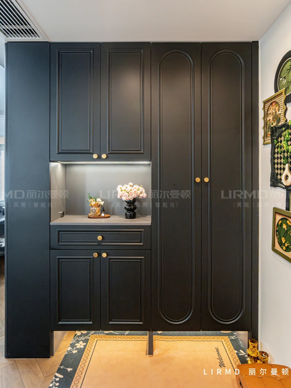 入戶玄關(guān):金剛黑柜門搭配金色拉手,大氣不占地!底部懸空放拖鞋,中間鏤空隨手放鑰匙,實用值MAX